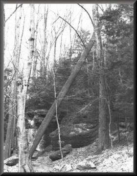 Not all trees grow straight toward the sky. This image shows a tree that was forced to grow at an angle because of the other trees and rocks around it.