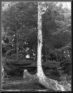 Despite the attempts to cut part of it away, this tree stands all alone in a dark forest.