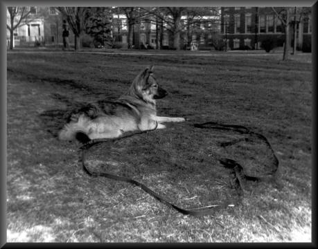 Newly trained Cheyenne, sits regally without her owner holding her leash. She loves to bask in the warm spring sunshine.