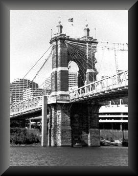 ![]() Taken from the Ohio River, this shot of the Suspension Bridge in Cincinnati, OH shows the beautiful design of the architect. This bridge was actually the prototype for the Golden Gate Bridge in San Francisco, and was seen in the movie "Rainman."